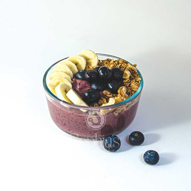Açai Bowl contains homemade granola topped with in-house toasted quinoa, combined with natural fruits! Packed with vitaimins with antioxidants... and under 500 calories!